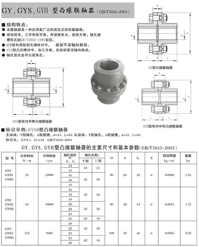 瑞安市寶德隆機(jī)械配件有限公司提供GY、GYS、GYH型凸緣聯(lián)軸器具有拆裝方便,快速安裝等特點(diǎn),廣泛用于連接/固定輪轂孔和零件的軸,例如齒輪,錐齒輪,鏈輪,葉輪,凸輪,皮帶輪和飛輪等軸的聯(lián)結(jié)固定,咨詢電話:18906872378