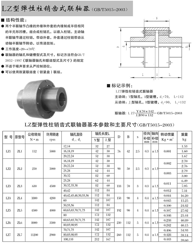 瑞安市寶德隆機械配件有限公司提供LZ型彈性柱銷齒式聯(lián)軸器具有拆裝方便,快速安裝等特點,廣泛用于連接/固定輪轂孔和零件的軸,例如齒輪,錐齒輪,鏈輪,葉輪,凸輪,皮帶輪和飛輪等軸的聯(lián)結固定,咨詢電話:18906872378